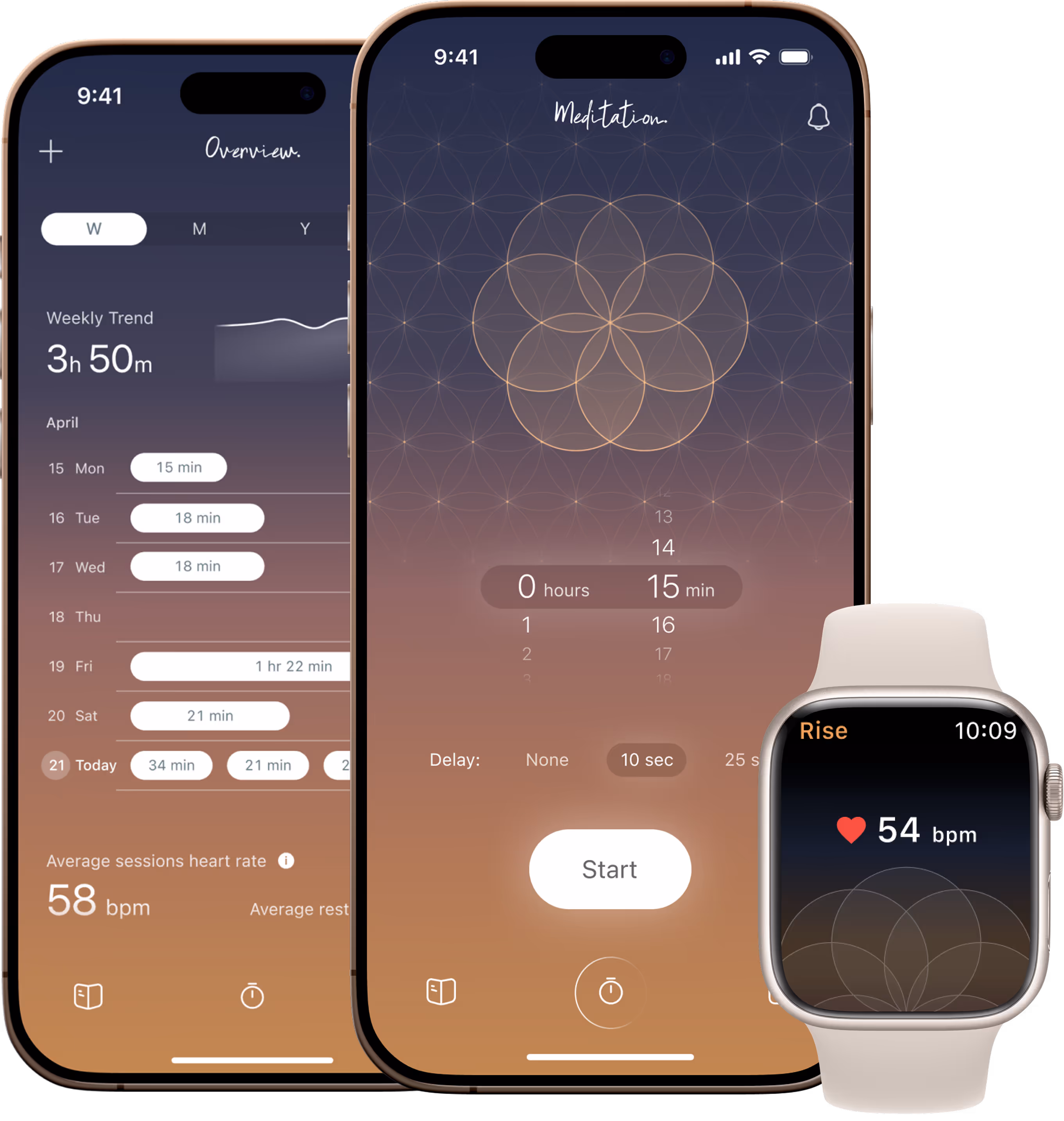 Rise keeps all your meditation time and heart-rate insights aligned with Apple Health, creating a clear picture of your long-term progress. And with Apple Watch, you can meditate anywhere without your phone, and every session syncs automatically so your practice stays connected and easy to follow.