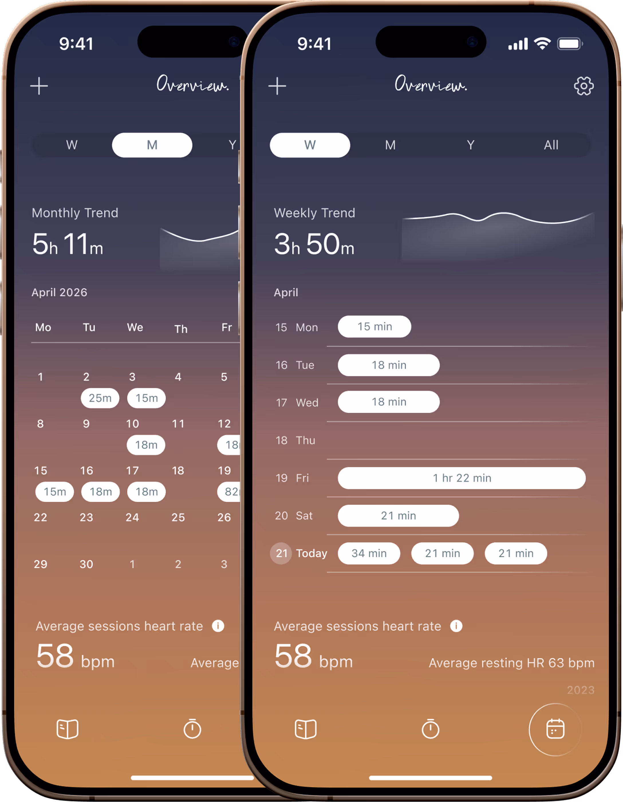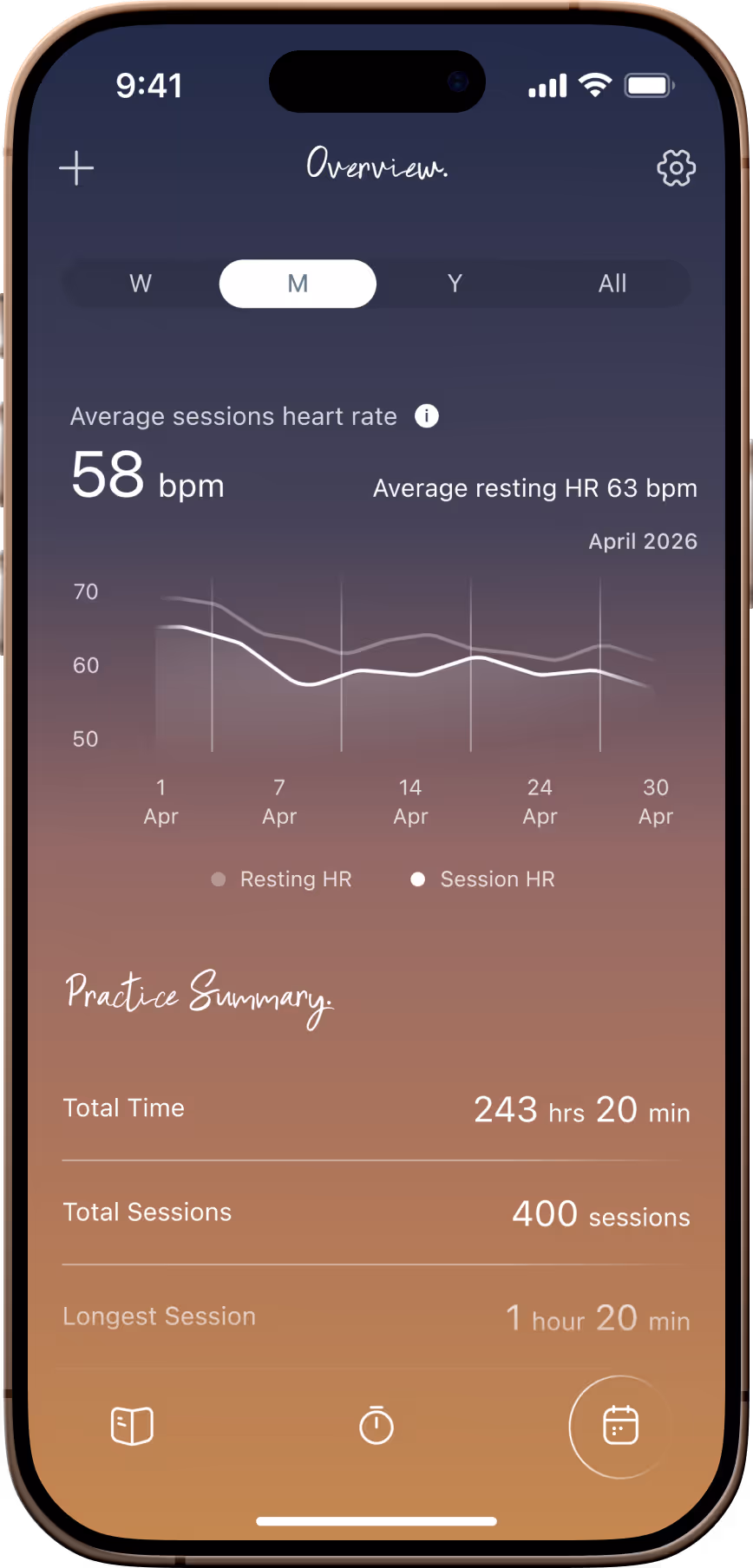 Heart-rate insights help you see the physiological effects of your practice in real time, showing how your nervous system calms, how your resting rate changes over time, and how different practices influence your body and mind.